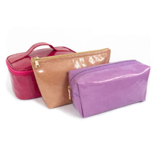 Beauty case in similpelle lucida con forma rettangolare e apertura frontale/superiore.
